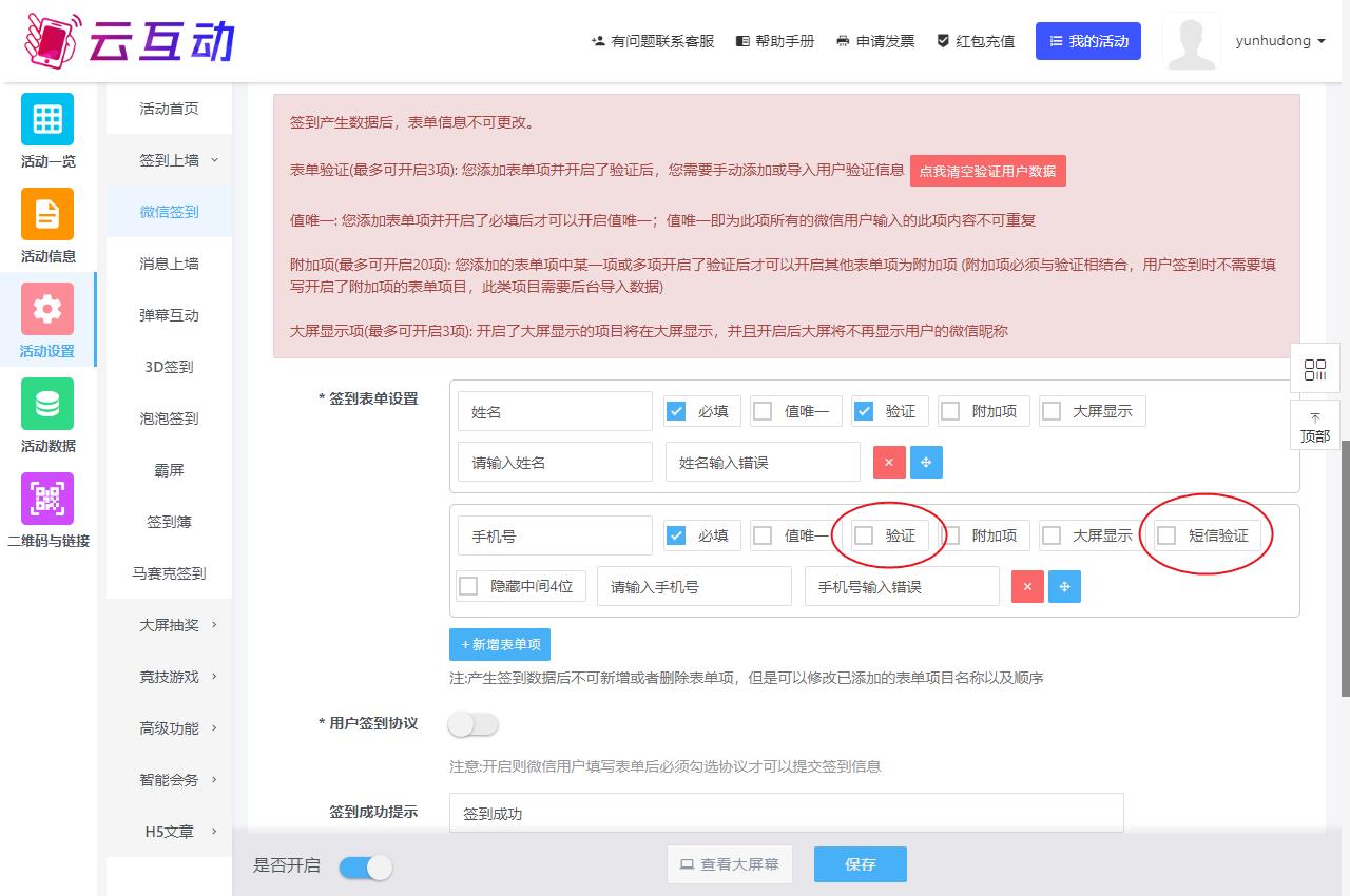 在江津云互动系统的微信签到表单中添加手机号签到字段后,在字段设置中有两个验证选项,一个“验证”一个“短信验证”,那么这两个验证选项有什么区别呢?分别是有什么作用?